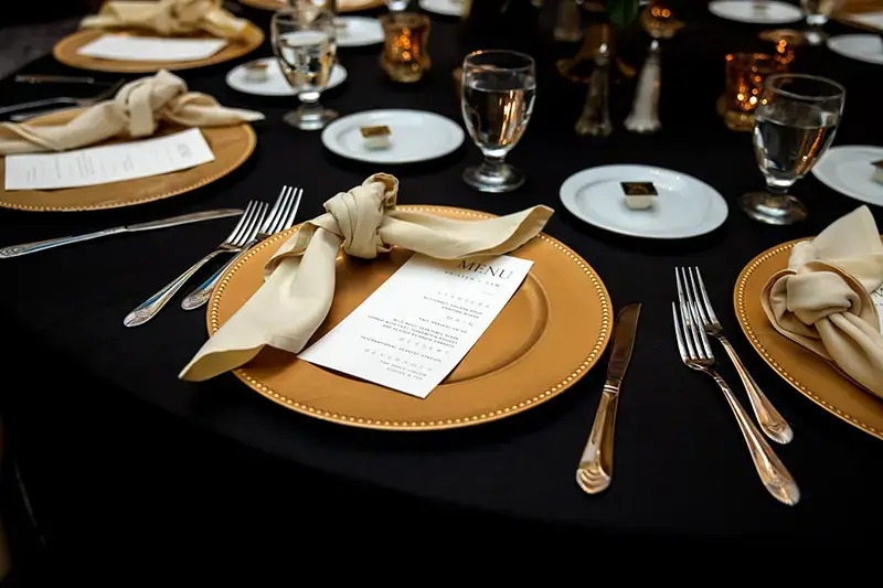 All packages include: Complimentary Bridal Suite for the couple, Floor-Length Linens, China, and Glassware, Dance Floor, Table Numbers, Cake Cutting, Coffee & Tea Service